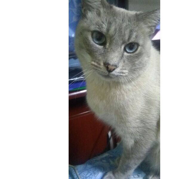 Pequeño gato macho, de pelo gris en la cabeza y el lomo, y blanco en pecho, ojoz azules, tiene entre 3 y 5 años. En una pata tiene una sección sin pelo. Se perdió subiendo a un techo. ¡Se ofrece recompenza!